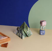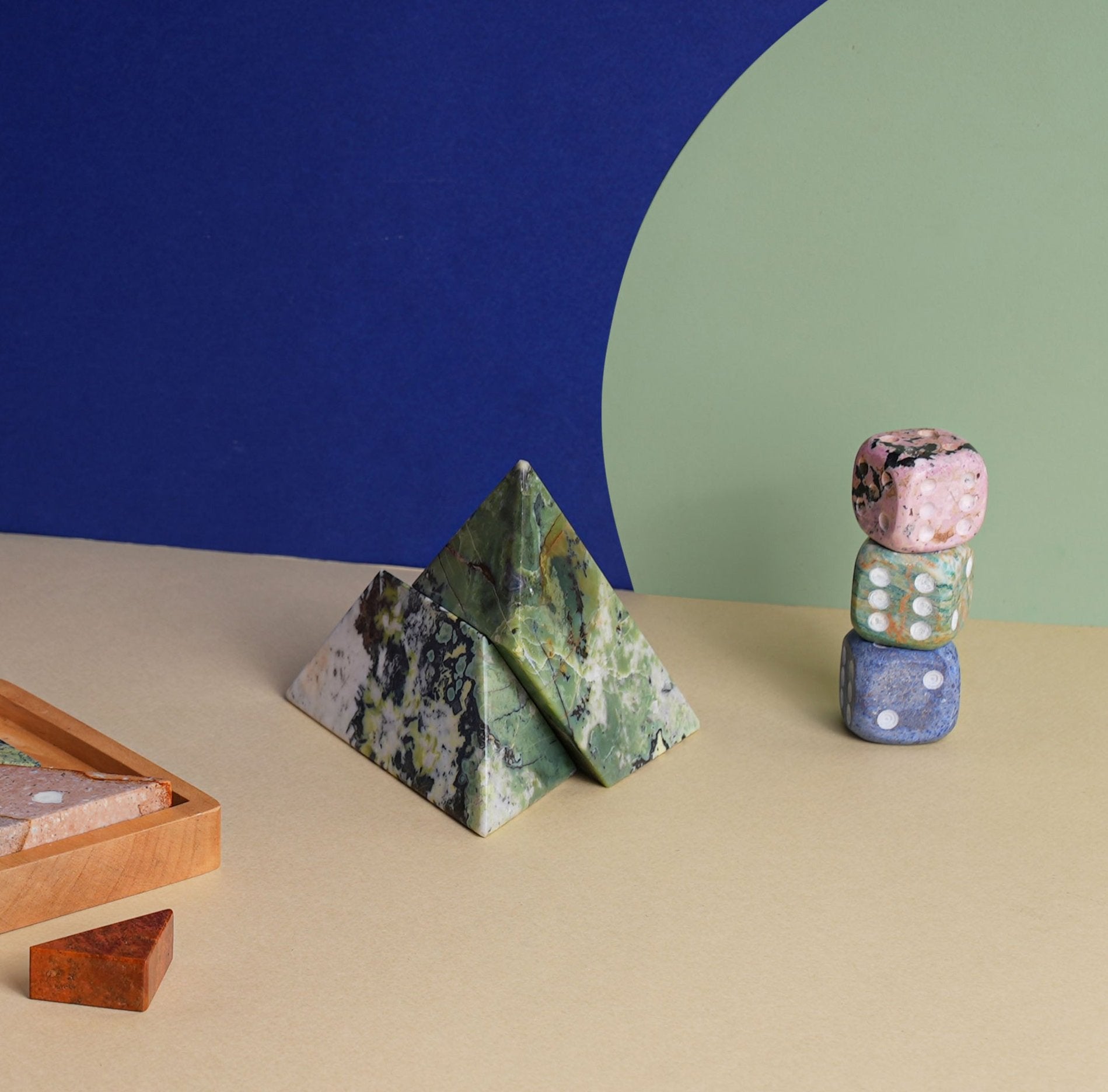 No es tan simple como parece a simple vista, esta elegante pirámide de dos piezas de DAR Proyectos está cortada en ángulos agudos y desafía la expectativa de que resolver la forma de la pirámide es tan fácil como parece. Esta pieza escultural es un objeto poderoso para decorar cualquier hogar u oficina. Disponible en una variedad de tonos nude con manchas de leopardo y verde serpentina, cada pedido viene con una variedad de los dos colores naturales dinámicos, cada uno único, un lote del siguiente.