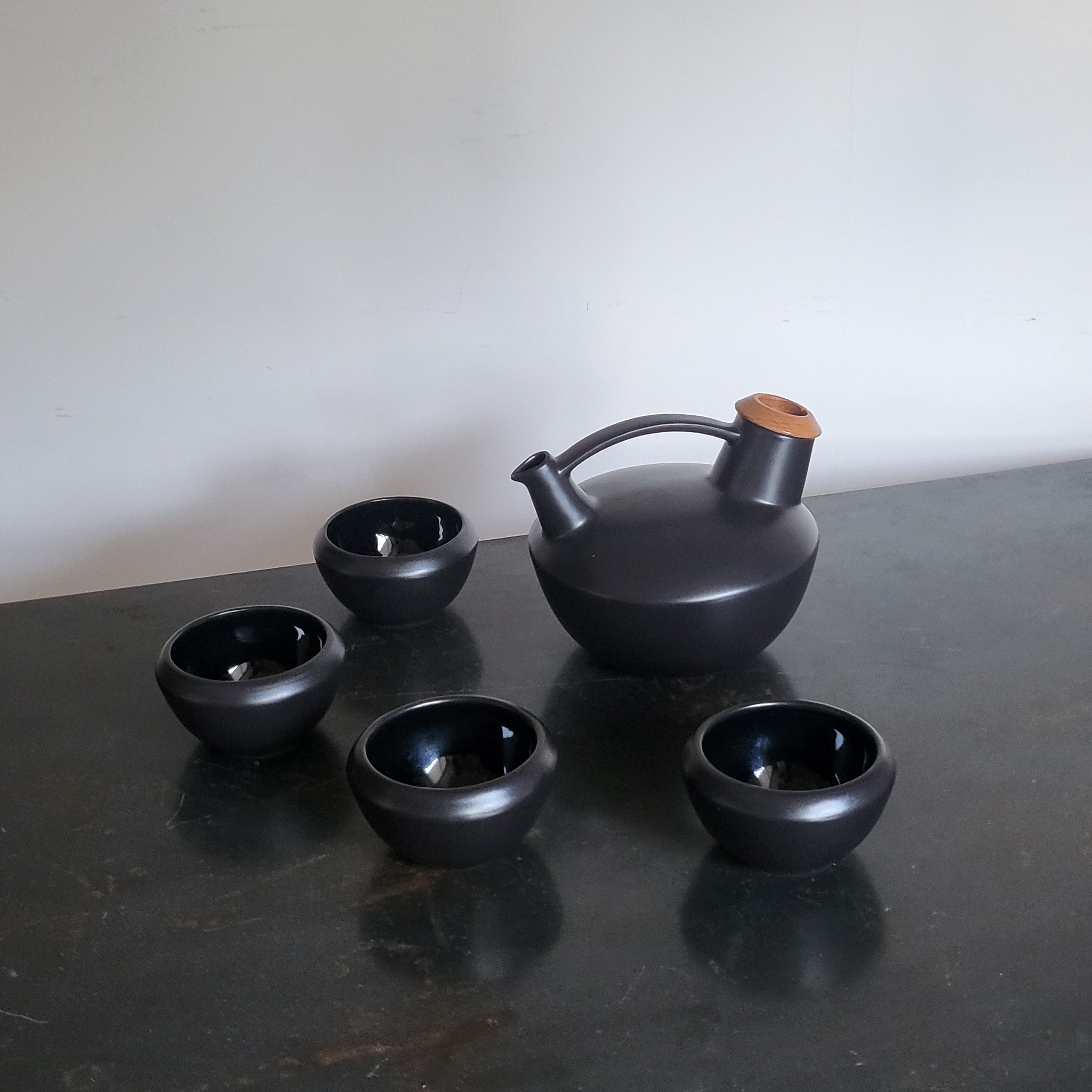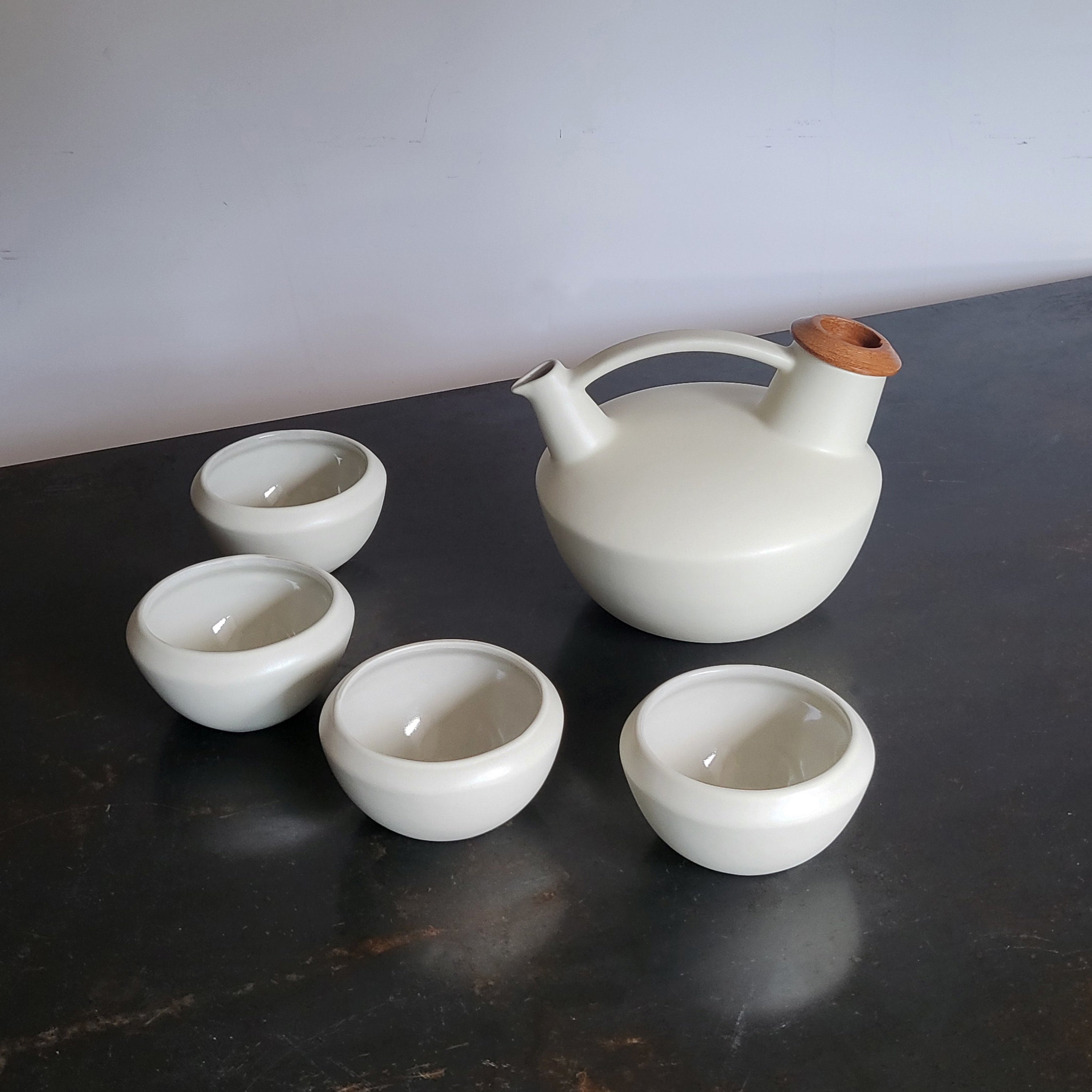 It consists of 5 pieces of high-temperature ceramic: 4 cups and a teapot (which in turn has a metal filter and a wooden lid).